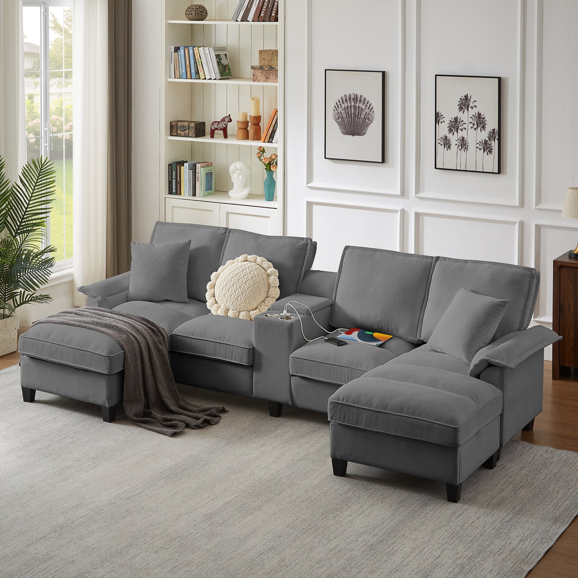 120' Modular Corduroy Sectional Sofa Bed with Storage – Modern U-Shaped Design, 4-Seater, Perfect for Living Room, Apartment, or Lounge, Featuring Cup Holders for Added Convenience